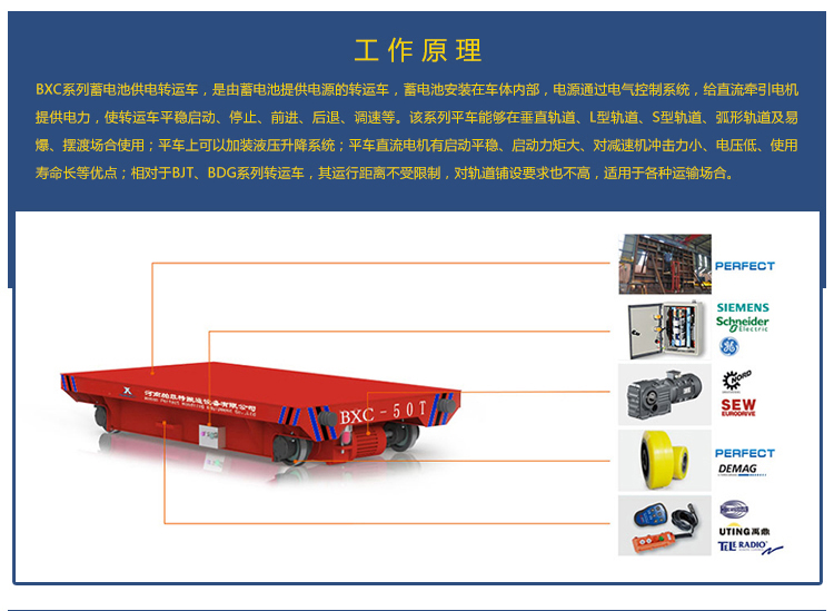 特点:蓄电池电动平车是一种以蓄电池作为电力来源的轨道平车,摆脱线缆的束缚,可采用遥控操作,使用时更加方便、安全,适用于较长距离的轨道运输系统。