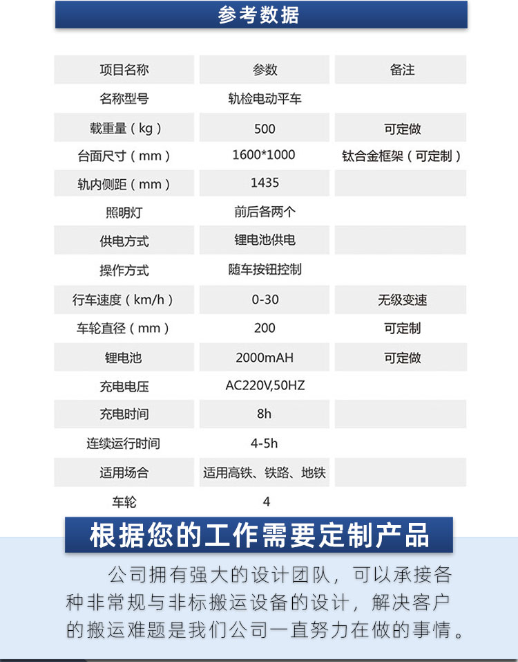 特点:轨道检修车的设计与制造应追求:运行安全、结构合理、操作简单、维修方便,其总体技术水平达到当今国内外同类产品的先进水平。 轨道检修车的结构(铝合金)