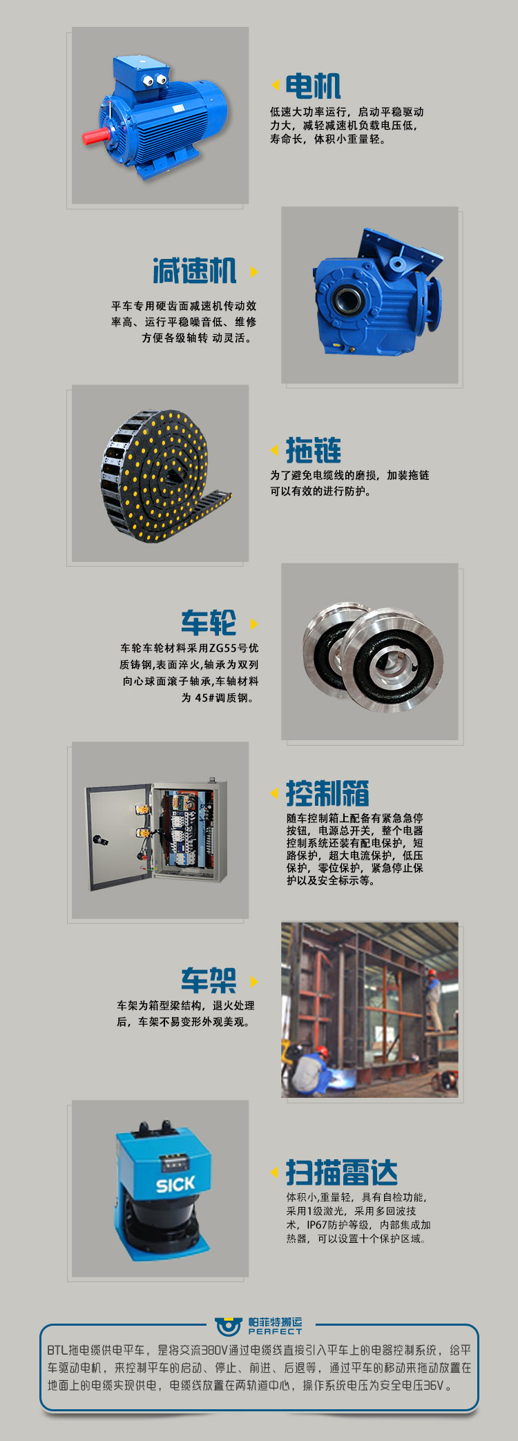 爱彩网特点:1.安全载重系数高 平车采用箱梁式结构,车轮采用的车加工,热处理,平车的安全系数可以达到1.5 2.自动化程度高 平车可以增加plc,实现自动化对接,无人操作车间 3.短途运行