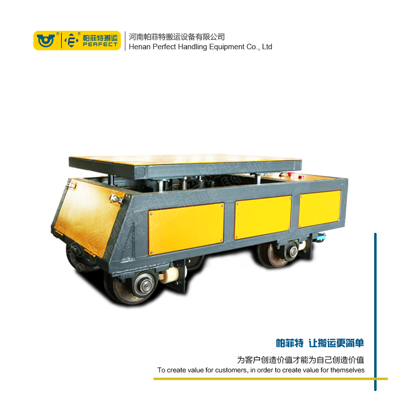 BDGS系列 产品是将交流 380V 的电源通过变压器降压至交流 36V 三相,分别接至三根道轨上(增加一条导电轨),轨道平车上的车轮的导电滑块将三根道轨上的交流 36V 电源引入车载电器箱,经过升压变压器将三相交流 36V 升压至三相交流 380V,再通过交流控制系统控制交流冶金电机,使平车启动、停止、前进、后退等。它能在 S 型轨道、弧形轨道及高温场合使用,平车上可以加装液压升降系统、起重系统,具有安全性与机动灵活性,对轨道铺设要求较高(需要绝缘处理轨道),适合载重量较大、中长距离运输场合使用。