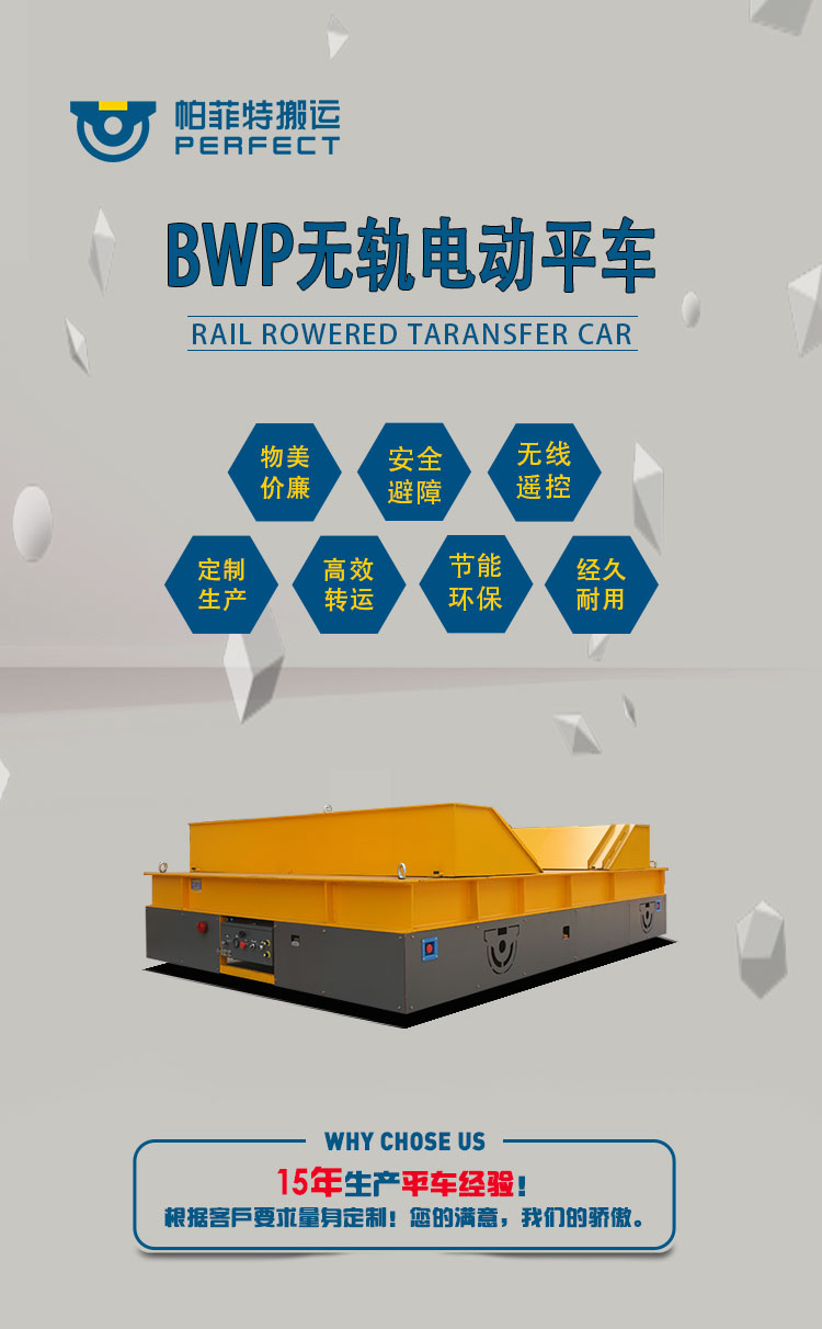 爱彩网特点:无轨电动平车是一种电动有轨厂内运输车辆。又称台车、过跨车、地爬车。它具有结 构简单、使用方便、容易维护、承载能力大、污染少等优点而作为短距离运输工具得到广 泛应用也可作为车间内部配合吊车运输重物过跨之用。