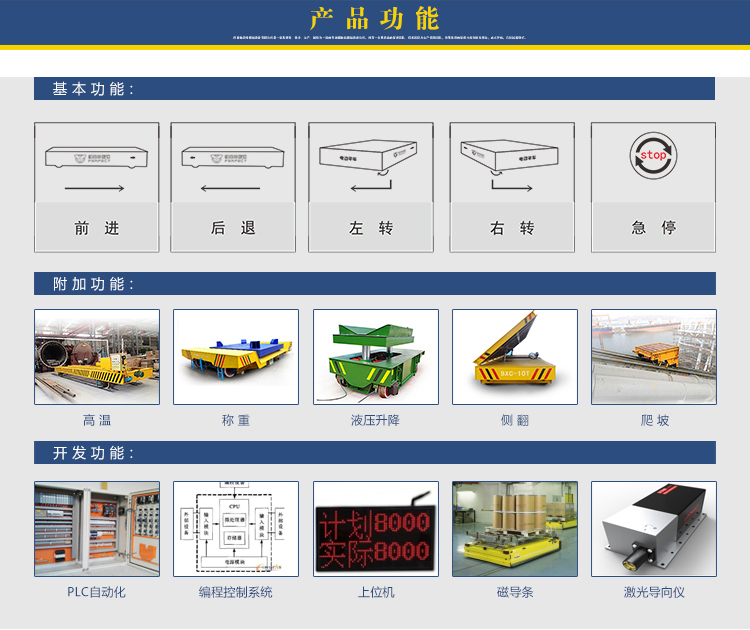BWP:无轨电动平板车是一种以蓄电池作为电源,电机减速机作为驱动系统,实心包胶车轮直接在地面行走的转运车,其运行不受限制,进口的车轮保证地面不受损坏,360°原地转弯适应更狭小的空间运行,360度无死角防护、遇人自动停止等功能,保证了运行过程中的阻碍问题。触摸屏、摇杆操作等设计使操作更加人性化。