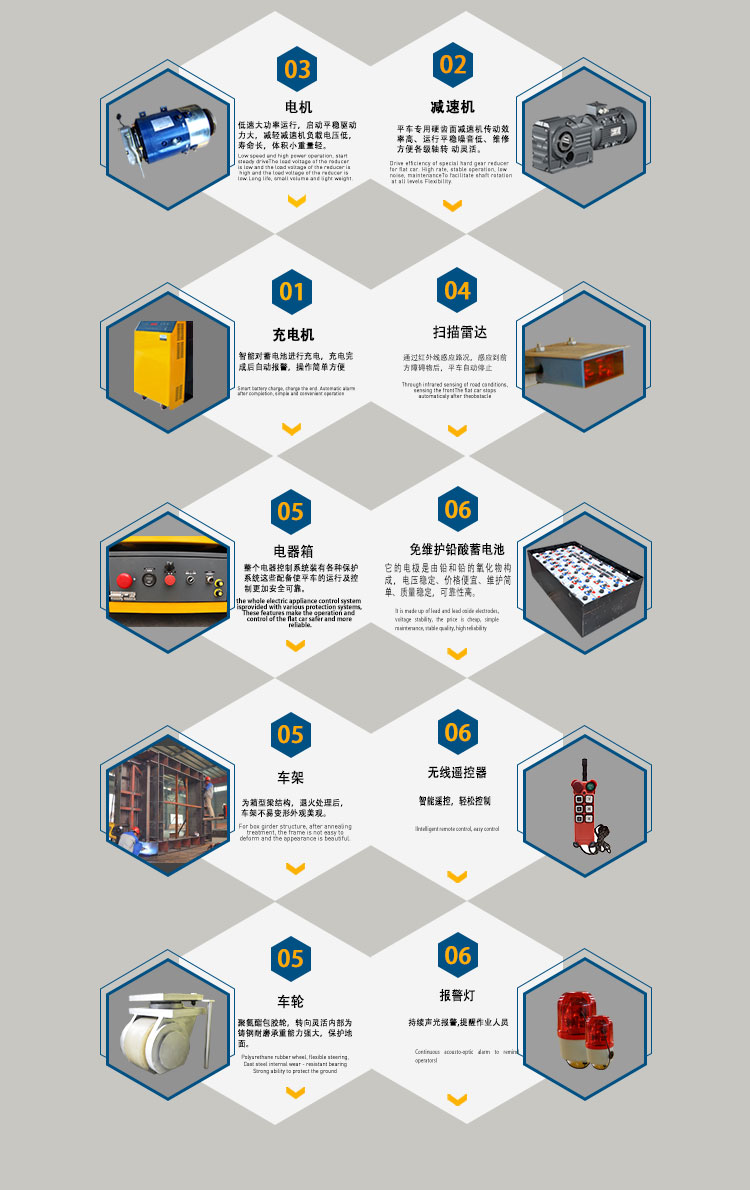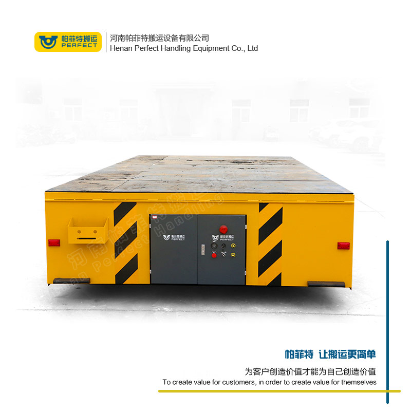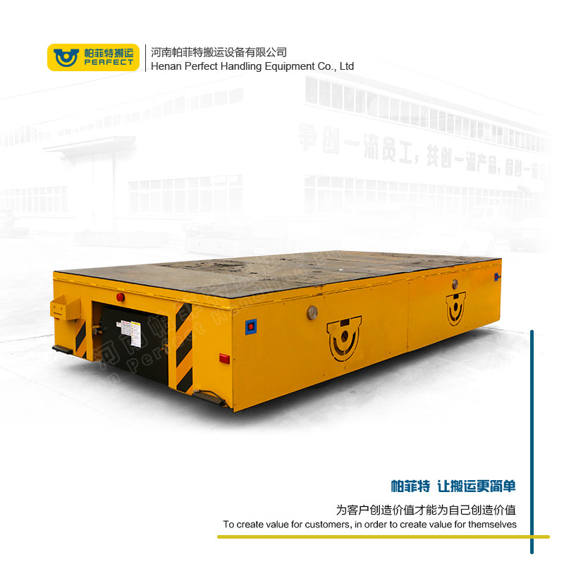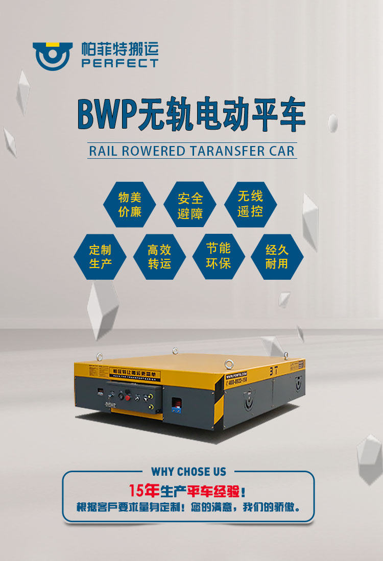 特点:无轨胶轮电动平车是一种以蓄电池作为电源,电机减速机作为驱动系统,实心包胶车轮直接在地面行走的转运车,其运行不受限制,进口的车轮保证地面不受损坏,360°原地转弯适应更狭小的空间运行