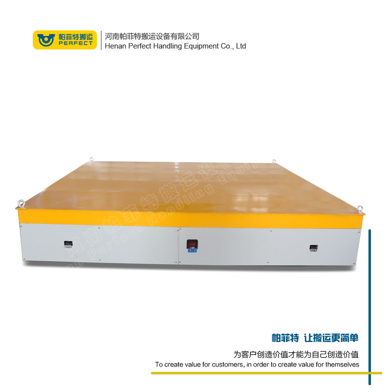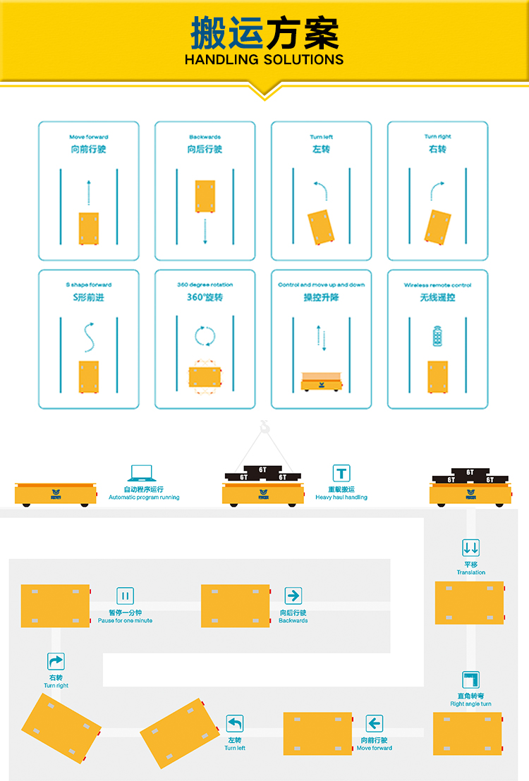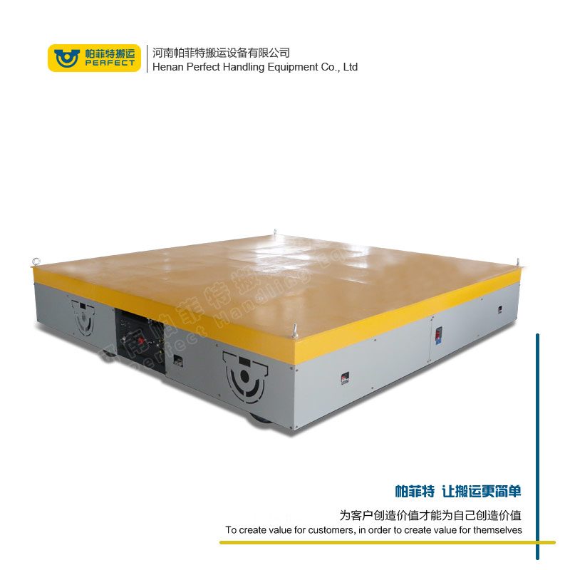 特点:无轨胶轮电动平车是一种以蓄电池作为电源,电机减速机作为驱动系统,实心包胶车轮直接在地面行走的转运车,其运行不受限制,进口的车轮保证地面不受损坏,360°原地转弯适应更狭小的空间运行,360度无死角防护